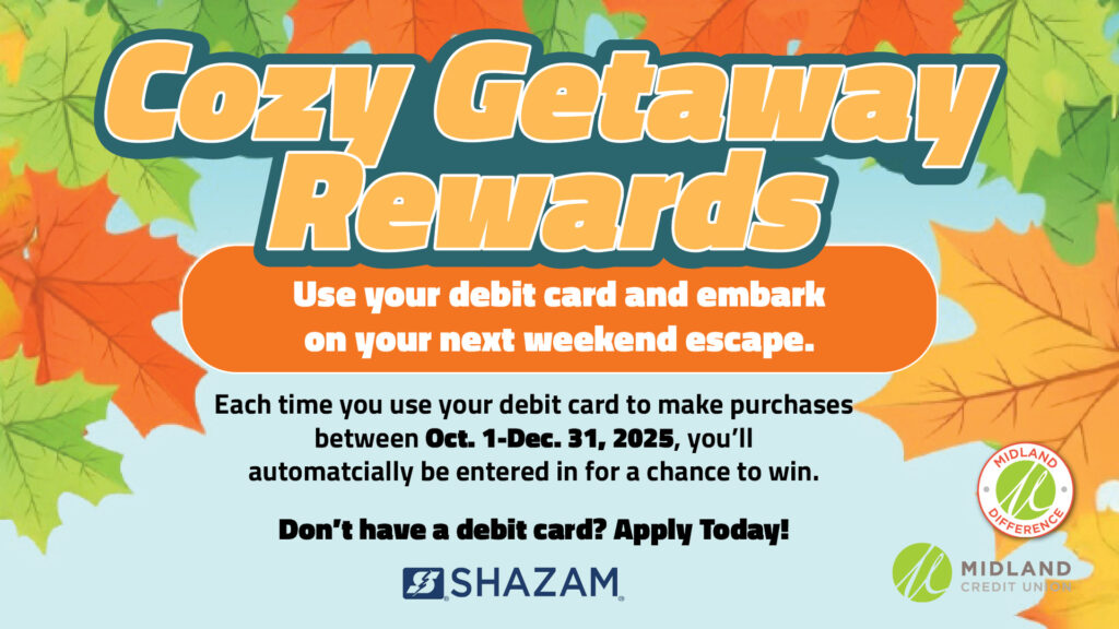 Use your Midland debit card at the register for a chance to win a $50 or $500 gift card. Purchases between October 1, 2025 and December 31, 2025 are eligible.